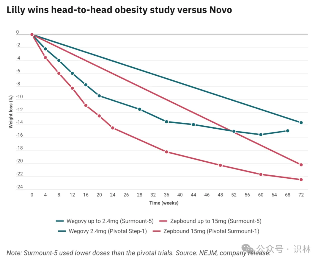 礼来公司在 12 月 4 日的新闻稿中表示,在一项头对头随机对照试验中,其减肥药 Zepbound(替尔泊肽) 比竞争对手诺和诺德的 Wegovy(司美格鲁肽)在减重方面更加有效。