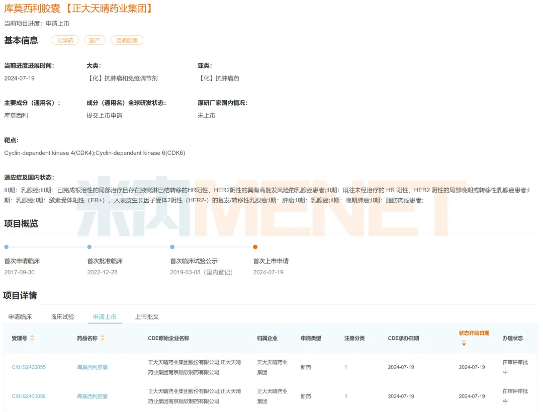 作为全球首个口服CDK2/4/6抑制剂联合内分泌治疗的Ⅲ期阳性结果,TQB3616有望成为HR+/HER-晚期乳腺癌新的重要治疗选择,也将成为正大天晴药业下一个获批的重磅抗肿瘤1类新药。米内网数据显示,目前该药已于2024年7月提交上市申请在审,上市可期。