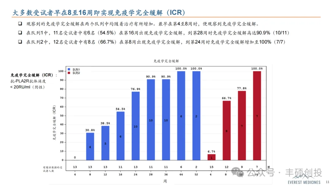免疫学应答方面,队列1(100mg QD×4w→100mg BID×32w)到第36周的免疫学完全缓解高达90.9%(10/11),队列2(200mg BID×36w)到第24周的免疫学完全缓解高达100%(7/7)。远高于同类竞品BTK抑制剂zanubrutinib到第24周免疫学完全缓解60%(12/20)(ASN 2024)。