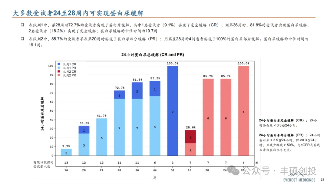 临床疗效方面,队列1到第36周的蛋白尿缓解率高达81.8%(9/11),队列2到24周的蛋白尿缓解率高达85.7%(6/7)。高于同类竞品BTK抑制剂zanubrutinib到第24周蛋白尿缓解率30%(6/20)(ASN 2024),以及另一款竞品抗CD20单抗MIL62到第24周蛋白尿缓解率62.9%(22/35)(ASN 2023),及52周蛋白尿缓解率80.0%(48/60)(ASN 2024)。