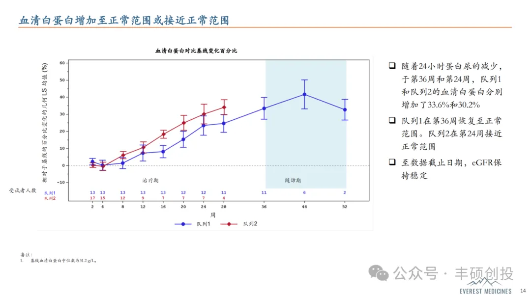 同时,血清白蛋白方面,队列1在第36周恢复至正常范围,队列2在24周接近正常范围。