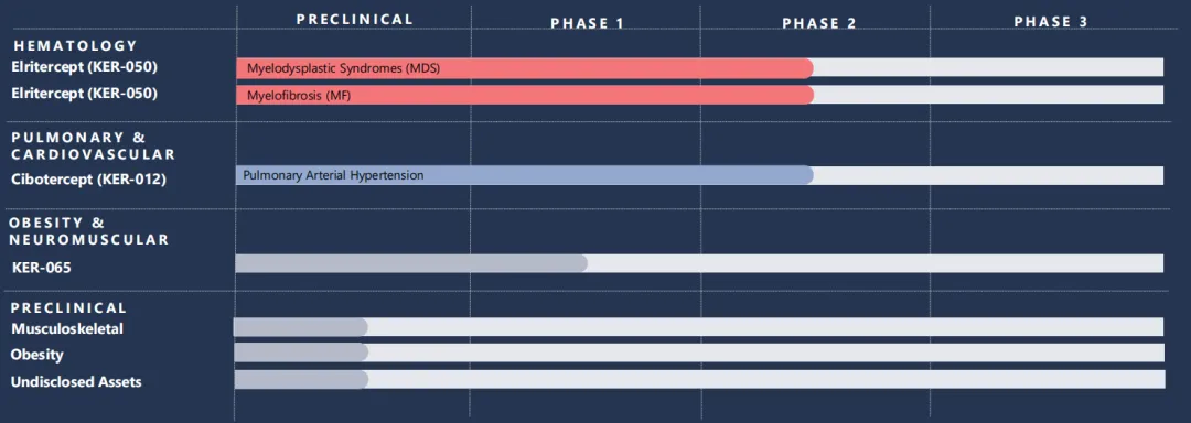 Keros首个候选产品Elritercept(KER-050),是一种“工程化的配体捕获体”,由经修饰的TGF-β受体(即激活素受体IIA型,ActRIIA)配体结合区域与人源抗体的Fc区域融合而成。KER-050正在被开发用于骨髓增生异常综合征(MDS)患者和骨髓纤维化(MF)患者血细胞减少(包括贫血和血小板减少)的治疗。