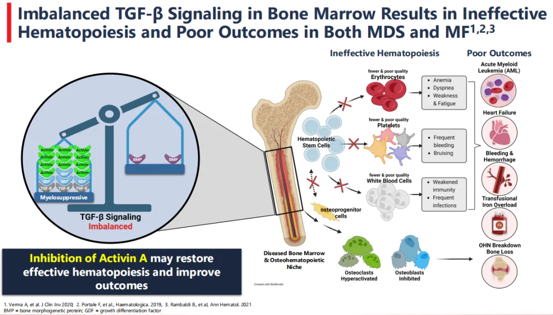 TGF-β超家族的信号转导在造血调节中十分重要,骨髓中TGF-β通路信号的失衡会导致无效造血和临床血细胞减少。KER-050旨在结合并抑制参与造血调节的TGF-β配体的信号传导,包括激活素A、激活素B和生长分化因子11,这些配体限制造血祖细胞继续分化并发育成具有特殊功能的成熟细胞。临床前研究表明,KER-050介导了针对这些调节因子的抑制作用,刺激祖细胞走向成熟,从而增加血液中成熟细胞的数量,进而有望恢复患者的有效造血并改善疾病预后。