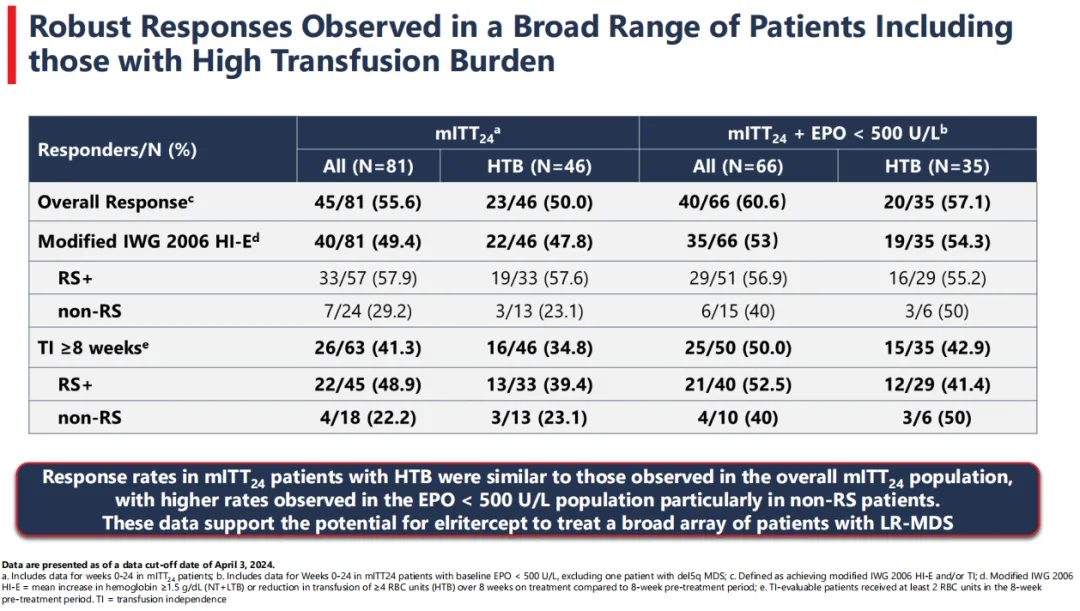 纳入疗效分析的81例患者中,55.6%(n=45/81)的患者在治疗的最初24周内达到血液学改善-红系(HI-E)或输血独立(TI)反应(ORR),而基线促红细胞生成素(EPO)<500U/L的患者ORR达到了60.6%(n=40/66)。