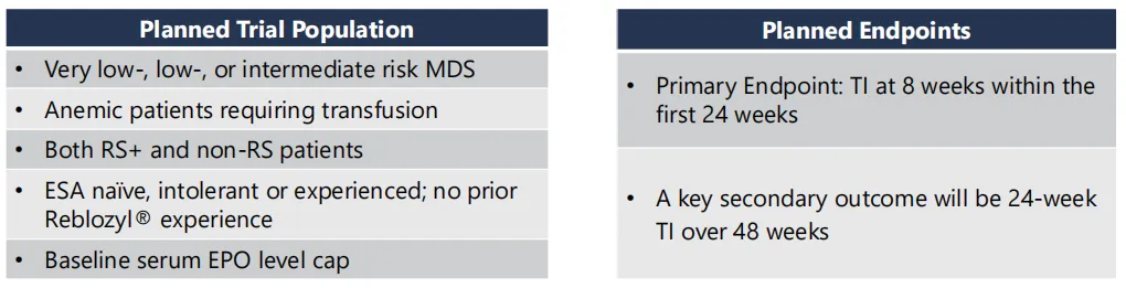 Keros围绕Elritercept(KER-050)开展了一项分为两部分的开放标签、多次剂量递增的2期临床试验,以评估Elritercept治疗极低危、低危或中危骨髓增生异常综合征(MDS)患者贫血的疗效,无论这些患者既往是否接受过红细胞生成刺激剂治疗(NCT04419649);以及一项分为两部分的开放标签、多剂量递增的2期临床试验,以评估Elritercept作为单药疗法或与JAK抑制剂芦可替尼联合治疗骨髓纤维化(MF)患者相关血细胞减少症的疗效(RESTORE试验;NCT05037760)。