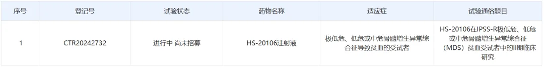 2021年12月,Keros与翰森制药宣布签订了独家许可协议,授予翰森制药在中国大陆、香港和澳门地区的开发、生产和商业化Elritercept(KER-050)的独家权益。根据协议条款,Keros在2022年1月收到了1800万美元的预付款,并有望获得高达1.705亿美元的开发和商业里程碑付款,以及产品净销售额的分级特许权使用费。2023年10月,CDE官网显示,Keros Therapeutics申报的1类新药HS-20106(KER-050)注射液获得临床试验默示许可,拟开发用于治疗各种原因导致的血细胞减少症。药物临床试验登记与信息公示平台显示,一项HS-20106在IPSS-R极低危、低危或中危骨髓增生异常综合征(MDS)贫血受试者中的II期临床研究正在进行中。(豪森药业)
