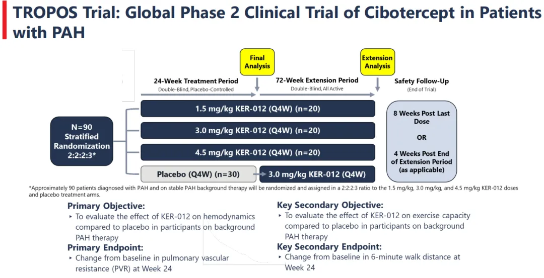 目前Keros开展了一项随机、双盲、安慰剂对照的全球2期临床试验,旨在评估Cibotercept联合标准治疗针对肺动脉高压(PAH)患者的疗效(TROPOS试验;NCT05975905)。2024年9月,该公司宣布TROPOS试验已经完成了患者筛选,预计将在2025年第二季度提供初步数据。