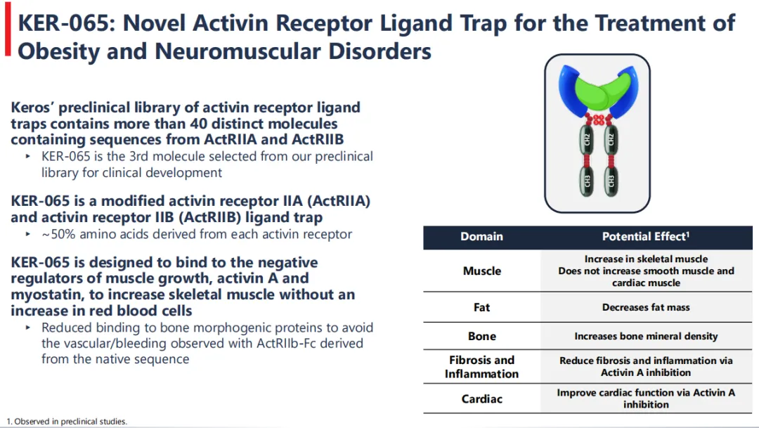 与GLP-1RA的作用机制不同,KER-065是一种经修饰的激活素受体IIA(ActRIIA)和激活素受体IIB(ActRIIB)配体陷阱,被设计用于结合并抑制TGF-β配体,包括肌肉生长抑制素(GDF8)和激活素A,它们是肌肉、骨量和骨强度的负调节因子。通过抑制这些TGF-β配体,Keros认为KER-065有望增加骨骼肌并通过增加能量消耗来减少脂肪量,提高胰岛素敏感性并改善心脏功能。此外,与肠促胰岛素联合使用,KER-065或可改善肌肉流失,进一步减少脂肪量并直接改善心脏健康。