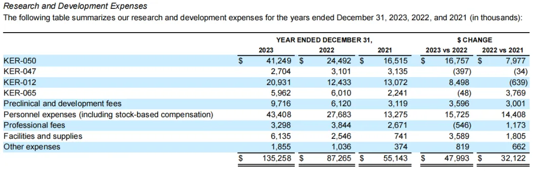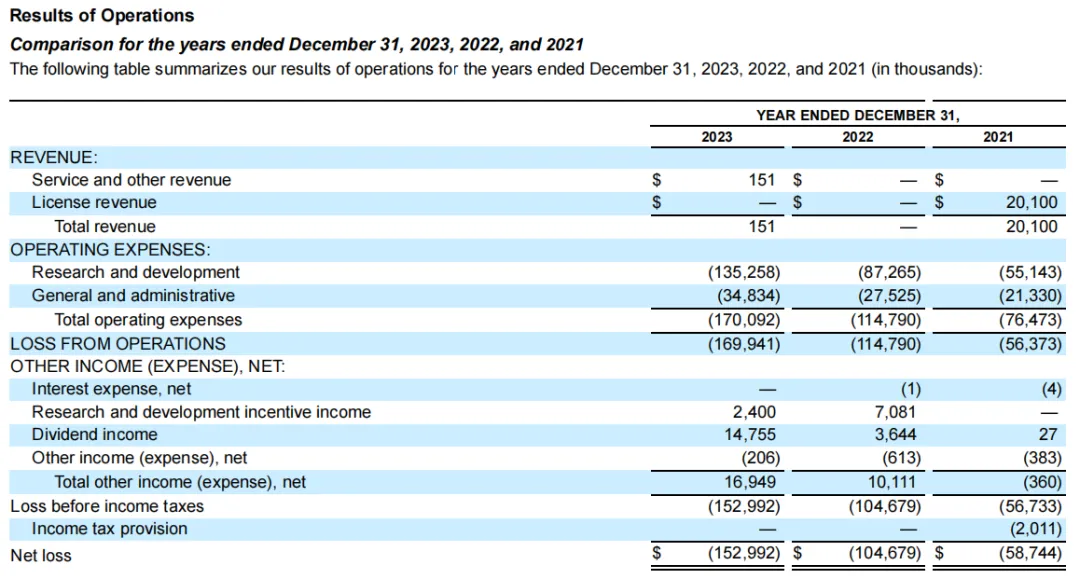 由于尚未有产品获批上市,Keros当前的收入仅来自于研究合作或知识产权许可。2023年度Keros公司净亏损为1.53亿美元,当年收入为15万美元,来自于Keros与翰森制药签订的制造技术转让协议,全年研发费用1.353亿美元,一般和管理费用为3480万美元。