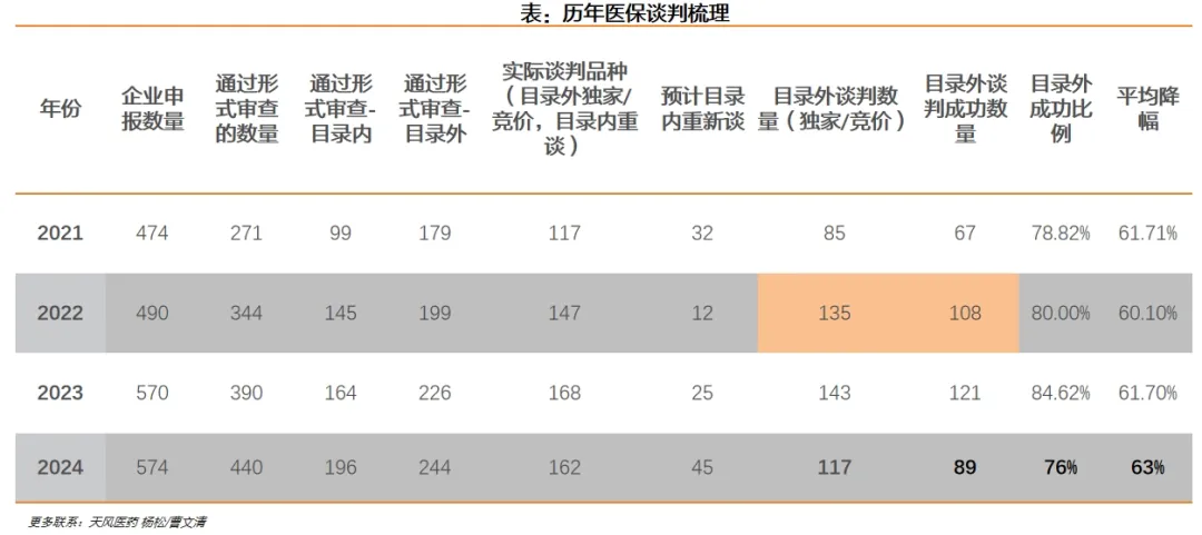 然而,今年遴选阶段的高要求,并没有转化成市场预期那般在谈判阶段对创新药的温和:574个申报品种最终只有162个进入谈判流程,无论是平均降幅还是目录外谈判成功率都比往年要严峻。