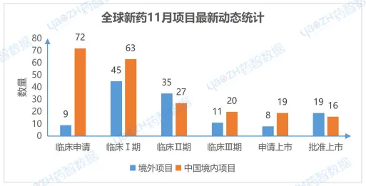 11月共741个药物有相关更新动态,其中有344个项目推进到最新的阶段,其中在中国境内进行的项目共217个,境外项目有127个。