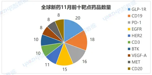 在新药研发靶点板块,11月有更新动态的741个项目中,涉及最多的靶点是GLP-1R,其次是CD19和PD-1,以下是排名前十的靶点,图中仅展示药品总数,具体药品内容可通过全球药物分析系统进行查看。