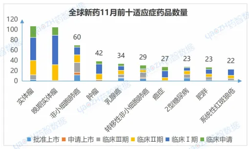 从适应症来说,11月有更新动态的741个项目中,涉及最多的适应症是实体瘤,其次是晚期实体瘤和非小细胞肺癌,以下是排名前十的适应症及其全球最高研发阶段情况,图中仅展示药品总数,具体药品内容可通过全球药物分析系统进行查看。