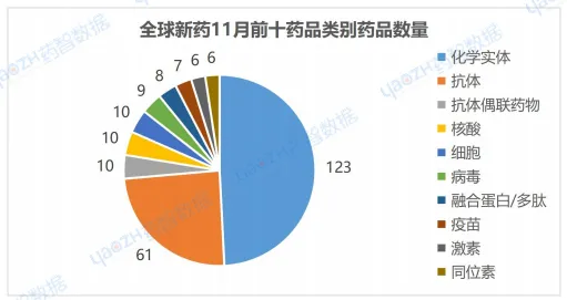 从成分类别分析,11月有最新进展的相关药品占比前三的分别是化学实体49%,抗体25%,抗体偶联药物4%。
