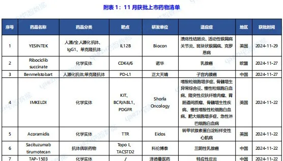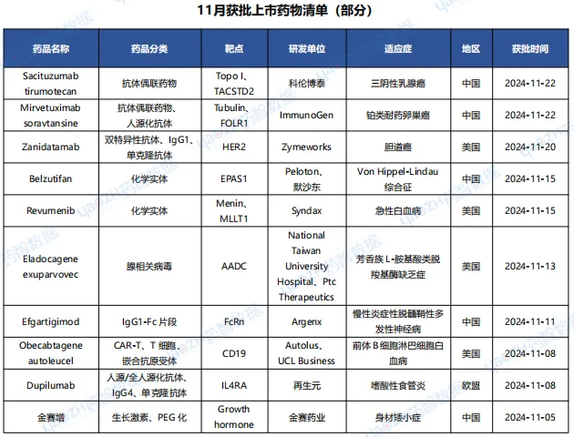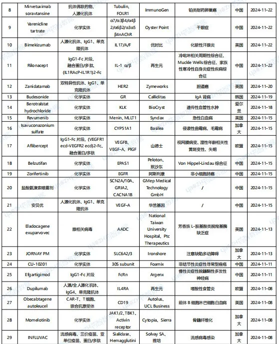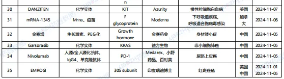 据全球药物分析系统数据库统计,11月全球共35款药物获批上市(包括新获批适应症),其中境外19个上市药品,中国境内16个药品,下表展示部分重点上市药物,文末附完整清单,更多药品信息可通过全球药物分析系统进行查看。