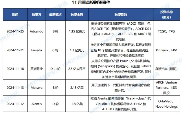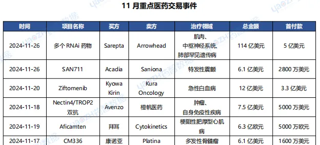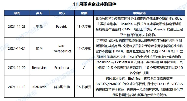 据投资格局数据库统计,2024年11月共372条医药交易事件、194条医药投融资事件和33项企业并购事件发生,重点交易信息如下,完整清单详见市场投资格局数据库。