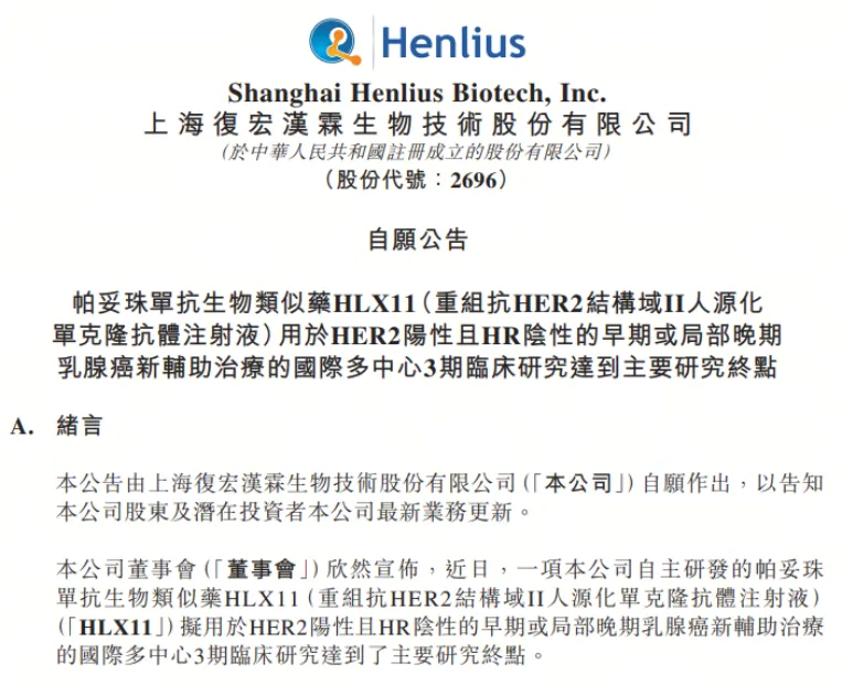9月份,复宏汉霖宣布帕妥珠单抗生物类似药HLX11新辅助治疗HER2+/HR-早期或局部晚期乳腺癌的Ⅲ期临床研究达到主要研究终点,也是复宏汉霖此次报产帕妥珠单抗注射剂的首要原因。