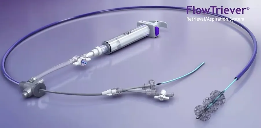 Trieve吸引导管是一种具有大腔径的导管,具有高度的可追踪性,可以与大口径注射器配合使用,快速吸出大量的血栓,同时减少血液损失。FlowTriever导管是一种具有三个自膨式镍钛合金网状盘的导管,有四种尺寸,旨在裂解血栓并将其输送到Triever20。