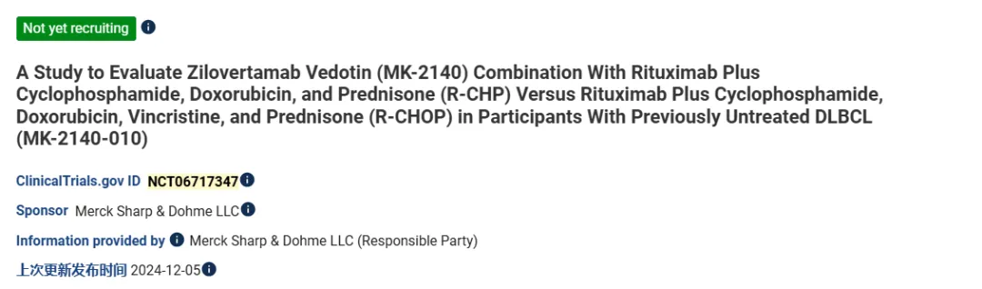 12月5日,据clinical trials网站显示,默沙东登记了一项关于ROR1 ADC药物Zilovertamab Vedotin(MK-2140)联合利妥昔单抗加环磷酰胺、多柔比星和泼尼松(R-CHP)与利妥昔单抗加环磷酰胺、多柔比星、长春新碱和泼尼松(R-CHOP)治疗既往未经治疗的弥漫性大B细胞淋巴瘤(DLBCL)患者的随机、开放标签、多中心、3期研究(waveLINE-010)。