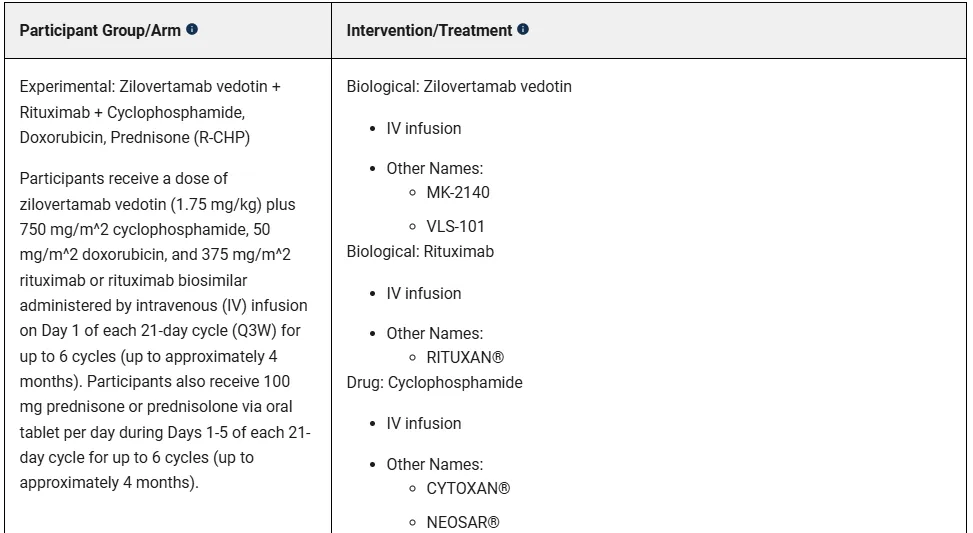该研究将于2025年12月启动,计划入组人数为1046例,评估与单独接受标准治疗的人相比,标准治疗联合 zilovertamab vedotin 是否可以帮助人们在没有癌症生长或扩散的情况下活得更久。主要临床终点为PFS。Zilovertamab Vedotin (MK-2140)三期采用的剂量为1.75 mg/kg。