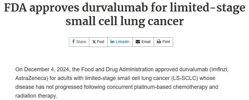 基于一项名为 ADRIATIC 的 III 期临床试验,阿斯利康的Imfinzi(durvalumab)可显著延长局限期小细胞肺癌 (LS-SCLC) 患者的总生存期和无进展生存期,美国食品药品监督管理局 (FDA) 于 2024 年 12 月 4 日批准 Imfinzi 用于治疗经同步铂类化疗和放疗后未进展的 LS-SCLC 成人患者。