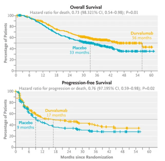 ●总生存期 (OS): Imfinzi 组的中位 OS 为 55.9 个月,而安慰剂组为 33.4 个月。这意味着与安慰剂相比,Imfinzi 使死亡风险降低了 27%。在三年生存率分析中,Imfinzi 组的 OS 率为 56.5%,而安慰剂组为 47.6%。