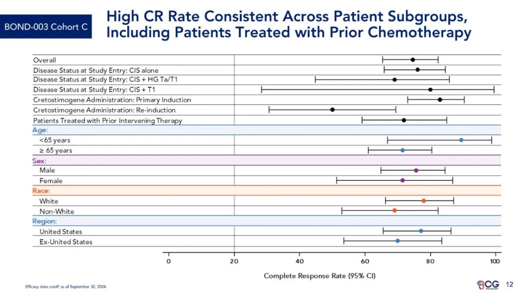 分析显示,在接受cretostimogene grenadenorepvec单药治疗后,74.5%的患者(82/110,95% CI:65.4%-82.4%)在任何时间点实现了完全缓解。值得一提的是,高CR率在各患者亚组中一致,包括既往接受过化疗的患者。