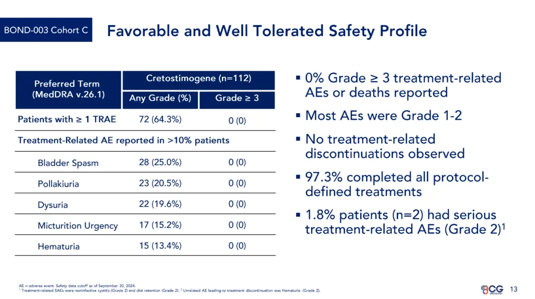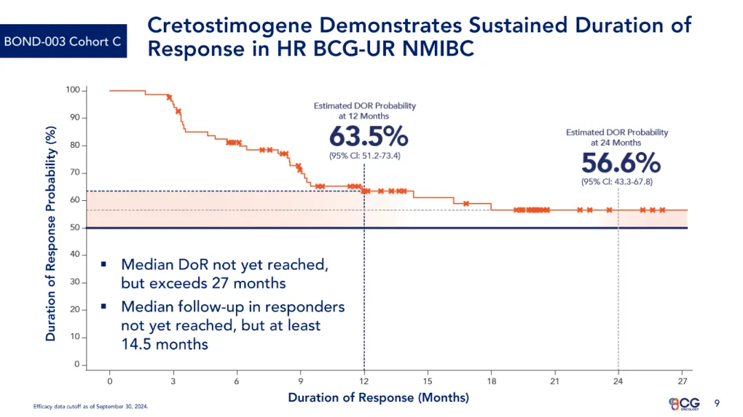 [1] Groundbreaking Cretostimogene Grenadenorepvec Monotherapy Data Demonstrates Sustained, Durable Complete Responses in High-Risk BCG-Unresponsive Non-Muscle Invasive Bladder Cancer. Retrieved December 5, 2024 from https://ir.cgoncology.com/news-releases/news-release-details/groundbreaking-cretostimogene-grenadenorepvec-monotherapy-data