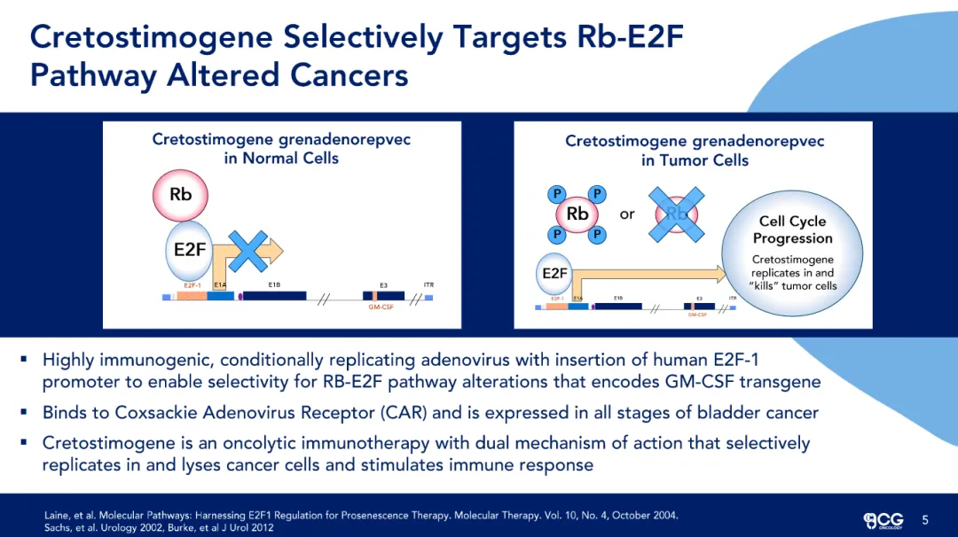 Cretostimogene grenadenorepvec是一种膀胱内给药的溶瘤病毒疗法,基于一种改造的5型腺病毒(Ad5)骨架,包括一个肿瘤特异性启动子,和一个编码粒细胞-巨噬细胞集落刺激因子(GM-CSF)的转基因。在裂解肿瘤细胞后,GM-CSF与肿瘤特异性抗原和其他危险信号一起释放。GM-CSF可以激活树突状细胞(DC),DC细胞识别肿瘤抗原,并将其呈递给细胞毒性和辅助性T细胞,从而促进其成熟。然后,这些T细胞能够在整个身体中循环,识别并攻击残留的肿瘤细胞。