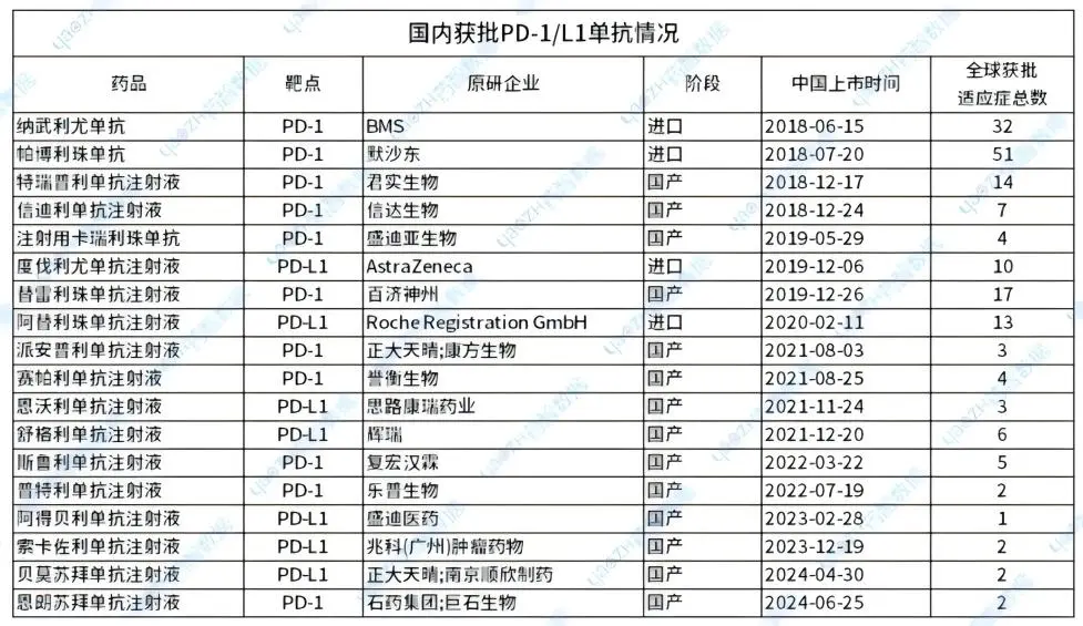 国内获批PD-1/PD -L1单抗情况