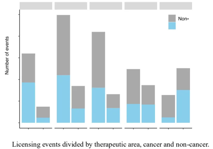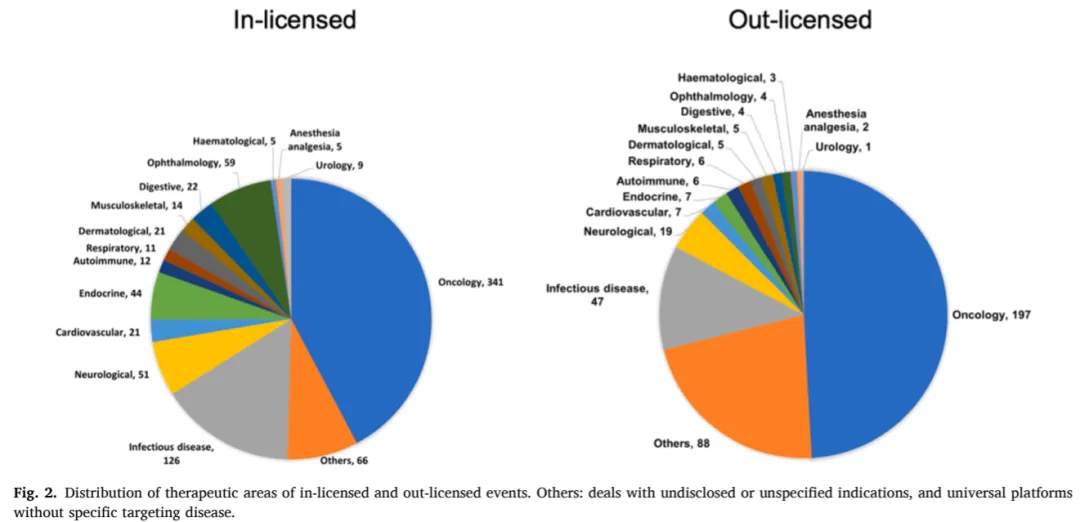 非肿瘤药物在license-in交易中的占比逐年上升,从2019年的42%增至2023年的80%。而在license-out交易中,其占比从68%降至40%,展现出相反的趋势。