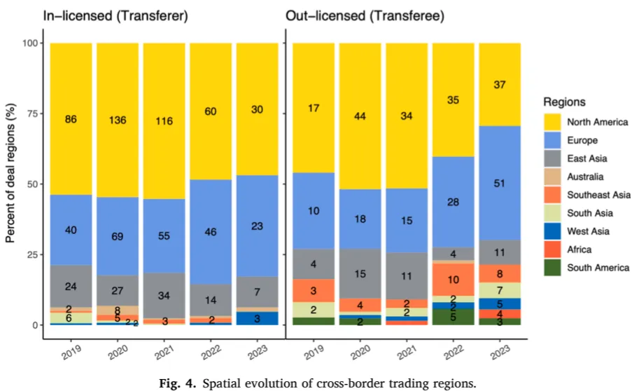 近期,中国医学科学院肿瘤医院李宁、王书航教授团队在Pharmacological Research杂志上发表了一篇关于中国药品许可交易趋势的文章,描绘了过去五年中国药品技术许可的全面图景,呈现了中国医药行业从“引进来”到“走出去”的发展历程。许可引进(license-in)交易下降而对外授权(license-out)交易增长,这一趋势标志着中国药品的创新性正在不断提升。这篇文章有助于我们深入了解中国在跨境药品许可方面所处的创新地位,以及推动其增长的背后因素。