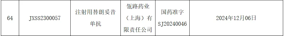 12 月 10 日,NMPA 官网显示,瓴路药业/ADC Therapeutics 研发的替朗妥昔单抗(Loncastuximab tesirine)获批上市,适应症为单药治疗复发/难治性弥漫性大 B 细胞淋巴瘤(R/R DLBCL)。值得一提的是,这是国内首个获批的靶向 CD19 的 ADC 药物。
