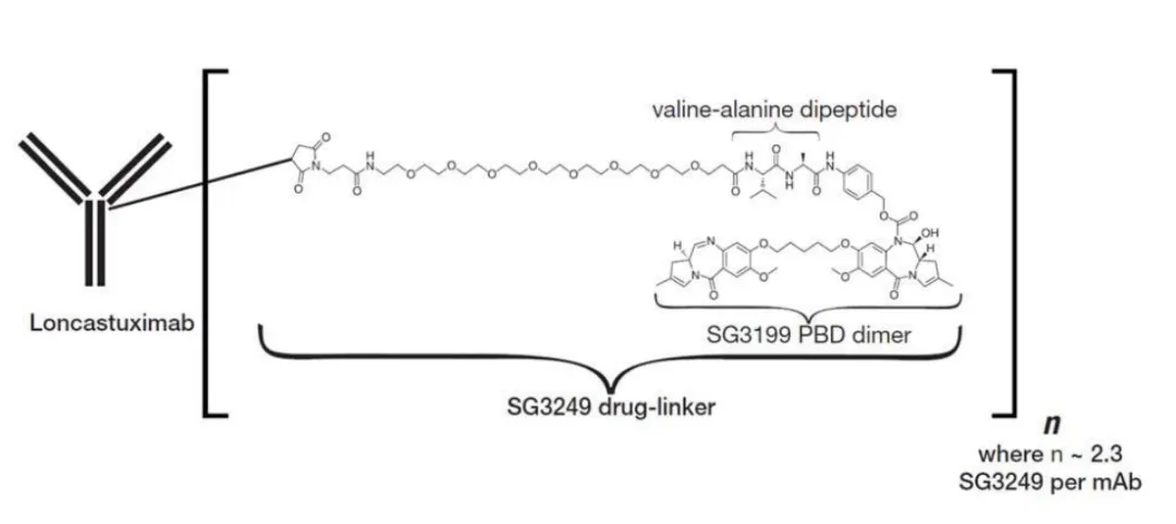 图片来源:NMPA 官网替朗妥昔单抗通过可裂解的二肽连接子将毒素 SG3199(PDB 二聚体)与抗体连接,DAR 值约为 2.3。当与表达 CD19 的肿瘤细胞结合时,会被细胞内化,随后释放 PDB 二聚体细胞毒素。PBD 与 DNA 小沟结合,形成强效的细胞毒性 DNA 链间交联,导致 DNA 复制停滞,阻断细胞周期从而导致肿瘤细胞死亡。