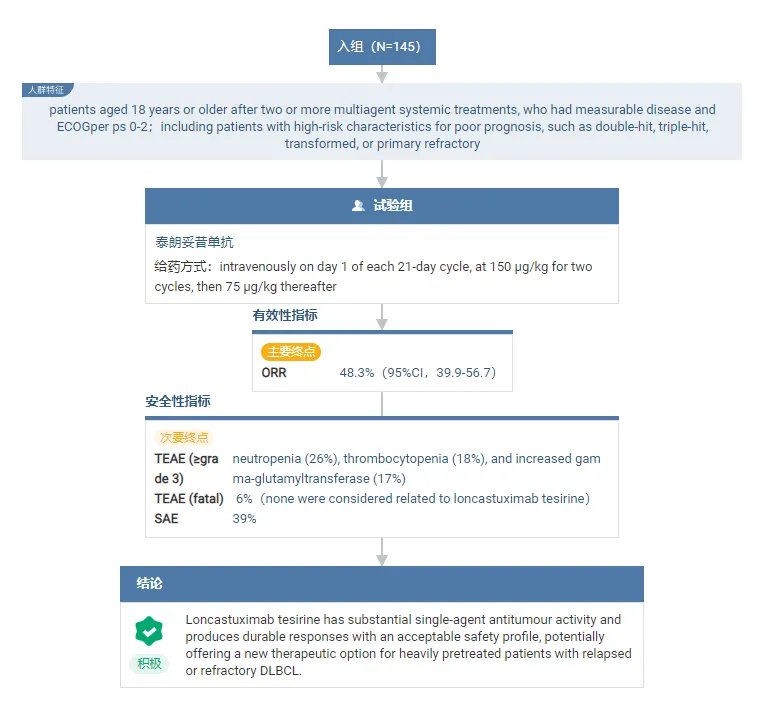 FDA 批准是基于 LOTIS-2 (NCT03589469) 研究,这是一项开放标签、单臂 II 期临床研究,纳入 145 名复发或难治性 DLBCL 或高级别 B 细胞淋巴瘤成年患者,这些患者既往接受的中位系统治疗的线数为 3 种,包括对一线治疗耐药的患者、对既往所有治疗均无效的患者、具有双/三打击的患者,以及造血干细胞移植和 CAR-T 治疗后复发的患者,主要终点指标是 ORR。