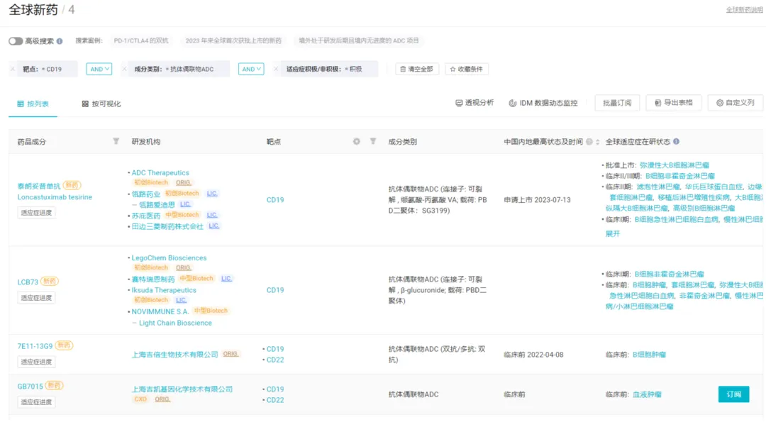 目前,CD19 靶向的 ADC 药物布局者并不多,处于活跃状态的仅四款,其中两款为靶向 CD19/CD22 的双抗 ADC 药物,均处于临床前阶段;其余还有一款 CD19 靶向的 ADC 进入 I 期临床。