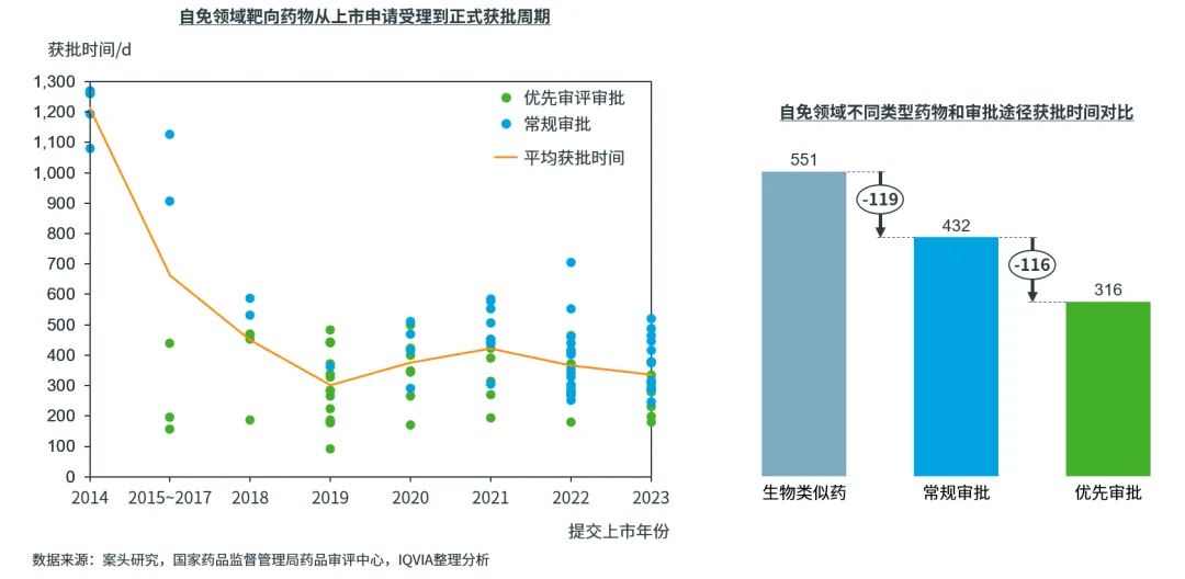 自2015年以来,我国已出台多项利好政策,支持创新药发展。为加速临床亟需药品等创新药品上市,国家药监局对创新药提供“优先审评审批”、“突破性治疗”等多种加速途径,利好的注册审批政策显著加快了创新药在中国的上市速度(审批端)。在自免疾病靶向治疗药物领域,2023年提交上市申请的药物,平均获批时间已缩短至337天,并且获得“优先审评审批”资格的靶向药物平均获批时间相比常规审批流程缩短近4个月(图4)。