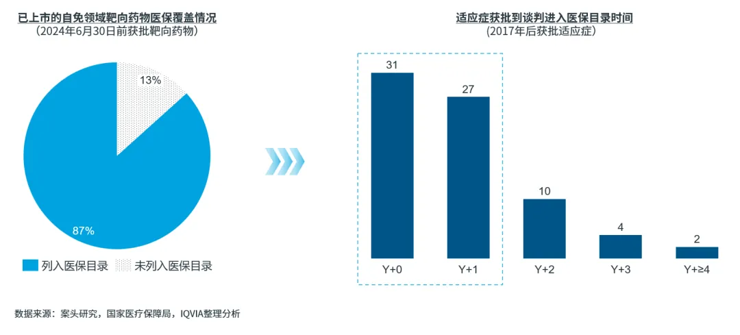 医保谈判机制逐渐成熟(支付端),常态化的医保谈判大大缩短了创新药从上市到进入医保的时间间隔,并且谈判药品“双通道”管理机制的建立缓解了“进院难”问题,进一步提升了创新药品可及性,帮助创新药更快释放商业潜能。据统计,在2024年7月前获批上市的自免靶向药物中已有近90%的药品被国家医保覆盖,绝大多数药品在适应症获批后的1年内即通过谈判进入医保(图5)。