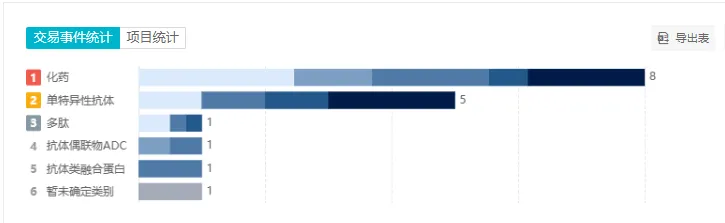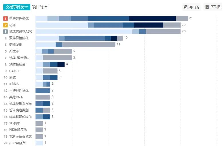 24 年已接近尾声。Insight 「医药交易」数据库显示,在今年(截至 12 月 9 日)已经发生的 101 起国产药品/技术 License Out 中, ADC 和化药的交易数量有 20 个,并列榜二,成为外资扫货的 TOP 级别热门药物。