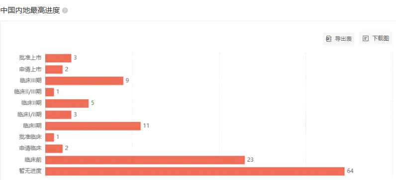 ADC 类药物是恒瑞新药管线布局的重点方向之一。Insight 数据库显示(截至 12 月 5 日),恒瑞的 ADC 矩阵拥有 19 款产品(仅统计活跃状态),其中 NDA 阶段的有 1 款,Ⅲ 期临床阶段的有 3 款 ,Ⅰ 期和 Ⅱ 期阶段的有 6 款。此外,还有多款 ADC 项目处于临床前研究阶段。从靶点布局来看,除了 HER2、TROP2、CLDN18.2 、c-MET 等常见靶点之外,恒瑞也有布局一些市场相对空白的靶点,例如 :PSMA ADC,国内尚无产品获批临床,全球也仅有 2 款在早期临床阶段;LIV-1 ADC,国内仅有 1 款进入临床,全球也只有 2 款在开展早期临床;DLL3 ADC,全球仅有 4 款在 Ⅰ 期临床,且都来自国内企业。这些产品的竞争格局目前都非常良好。