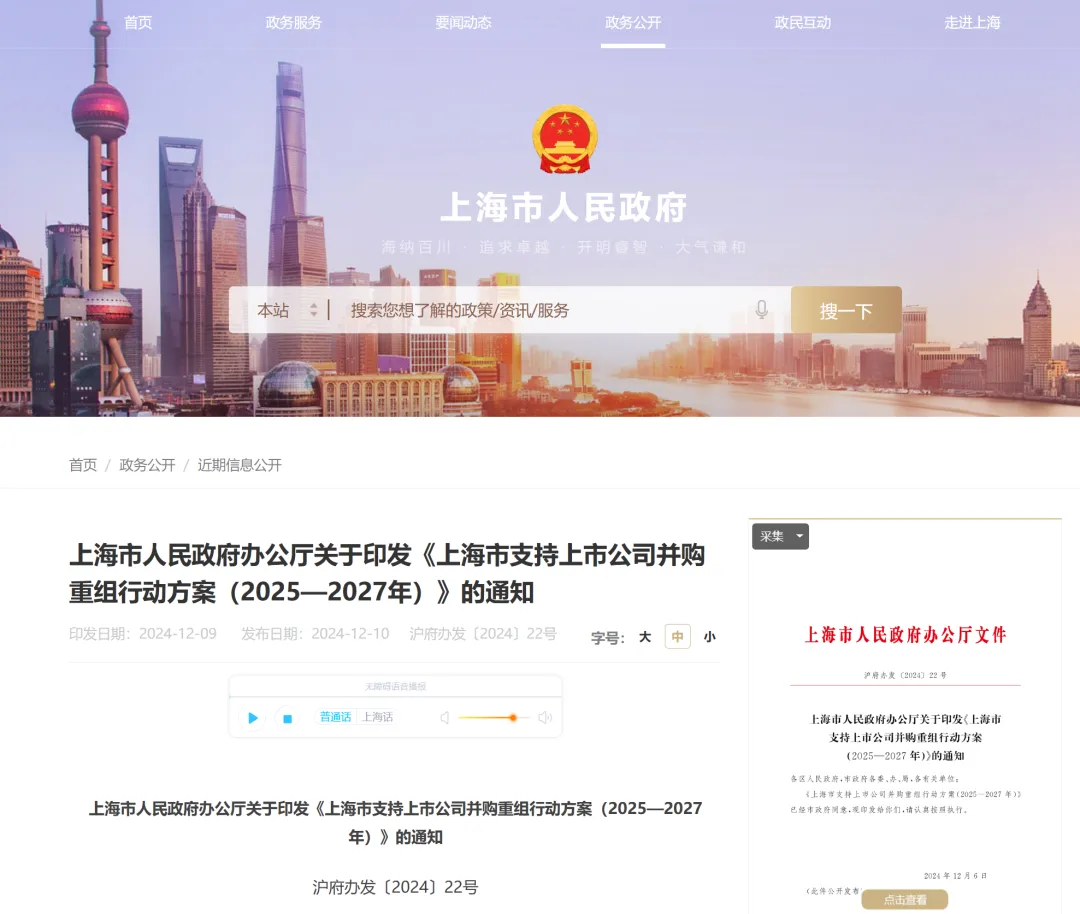 12月10日,上海市人民政府办公厅正式发布了《上海市支持上市公司并购重组行动方案(2025—2027年)》,明确提出设立100亿元生物医药产业并购基金,以进一步推动生物医药产业的创新发展和并购重组。