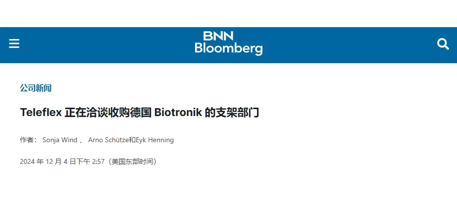 近日,彭博社消息,Teleflex Inc.(泰利福)正在商谈收购德国心血管巨头Biotronik SE& Co.(百多力)的血管介入业务。据消息人士透露,此次交易金额计划为5亿欧元(约合38.41亿元人民币)至10亿欧元(约合76.82亿元人民币)。另一位消息人士表示,协议最早可能在本月达成。