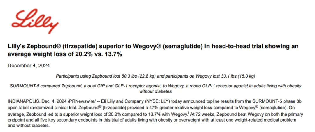 在安全性方面,SURMOUNT-5研究中替尔泊肽的整体安全性与之前SURMOUNT项目中的试验结果保持一致。最常见的不良事件与胃肠道相关,且通常为轻至中度。礼来表示,将继续深入分析该试验的结果,并计划将研究成果发表在同行评审期刊上,同时在明年的医学会议上公布。这一突破不仅为肥胖患者提供了新的治疗选择,也进一步提升了礼来在全球制药行业中的竞争力。