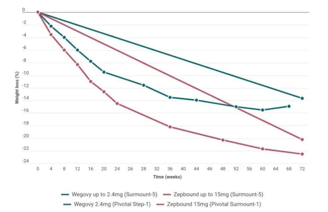 在这场备受瞩目的对决中,替尔泊肽展现出了令人瞩目的减重效果。研究结果显示,接受替尔泊肽治疗的受试者平均减重达到了20.2%,而司美格鲁肽治疗组则平均减重13.7%。具体而言,替尔泊肽治疗组患者平均减重50.3磅(约22.8公斤),相较于司美格鲁肽治疗组的33.1磅(约15.0公斤),减重效果高出了47%,为其在减重领域的优势提供了有力佐证。