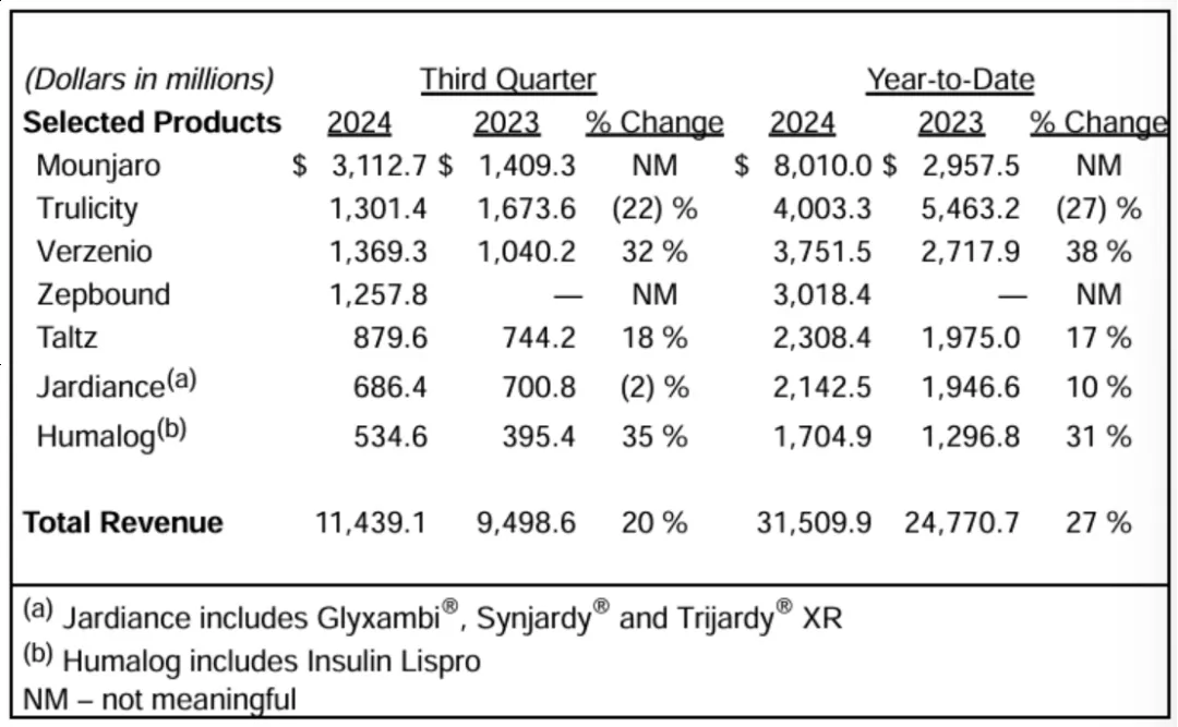 根据2024年第三季度财报,礼来的营收达到114.4亿美元,同比增长20%;前三季度营收总计315亿美元,同比增长27%。其中,替尔泊肽的糖尿病版本Mounjaro和减重版本Zepbound成为产品阵容中的明星,前三季度合计贡献了110亿美元的销售收入。尽管Zepbound的销售收入略低于分析师预期,但受到批发商渠道库存减少的影响,其市场表现依然强劲。