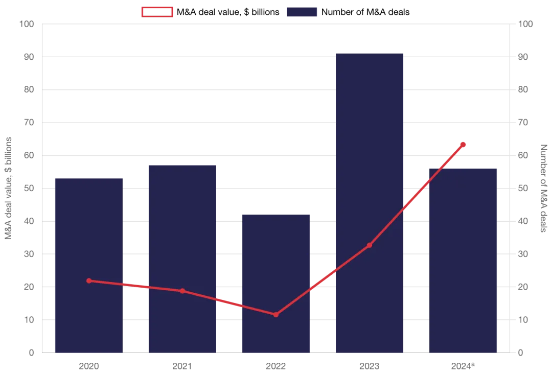 虽然生物制药行业仍处在低迷期,但细看的话,并购活动与过去几年水平相当,并已表现出回升势头。2024年前三个季度,生物制药行业共发生56起收购案,而2020年为53起,2021年为57起,2022年为42起。