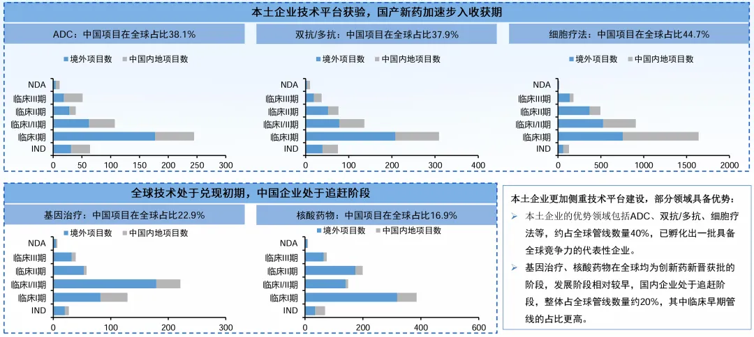 据国泰君安,本土创新药企的优势领域包括ADC、双抗/多抗、细胞疗法,约占全球管线数量40%,已孵化出一批具备全球竞争力的代表性企业。基因治疗、核酸药物在全球均为创新药新晋获批的阶段,发展阶段相对较早,国内企业处于追赶阶段,整体占全球管线数量约20%,其中临床早期管线占比更高。