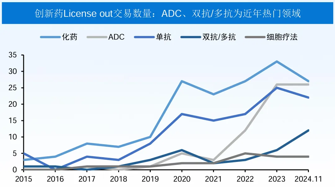 2024年至今,ADC海外License out数量与2023年基本持平,进入一个平台期,预计巅峰已过,2025年将逐步降温。