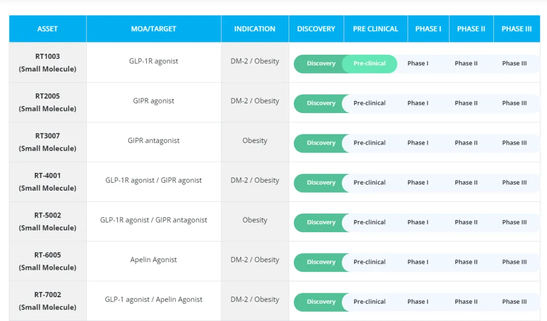 根据RenaissThera公司官网,该公司已经搭建了包含近10款产品的在研管线,进展最快的产品RT1003为一款GLP-1R小分子激动剂,目前处于Pre-clinical阶段。该公司正在开发一系列治疗2型糖尿病和肥胖症的产品,包括GIPR激动剂、GIPR拮抗剂、GLP-1R/GIPR双重激动剂、GLP-1R 激动剂 / GIPR拮抗剂、apelin激动剂、GLP-1/Apelin双重激动剂等。