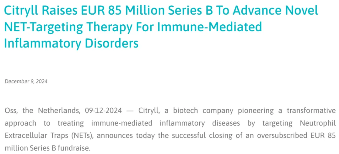 12月9日,荷兰奥斯,Citryll是一家生物技术公司,开创了一种通过靶向中性粒细胞外陷阱(NETs)治疗免疫介导的炎症性疾病的变革性方法,宣布成功完成超额认购的8500万欧元B轮融资。